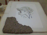 Tela em carvão de uma caricatura, que eu emoldureicom pasta de papel reciclado e pintei o degrade com tinta acrílica